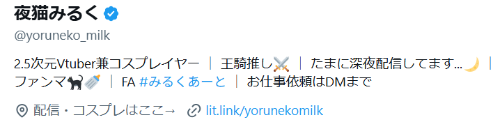 夜猫みるくさんのXのプロフィールを見ると「配信・コスプレはこちら」というlit.link(リットリンク)が貼られています。